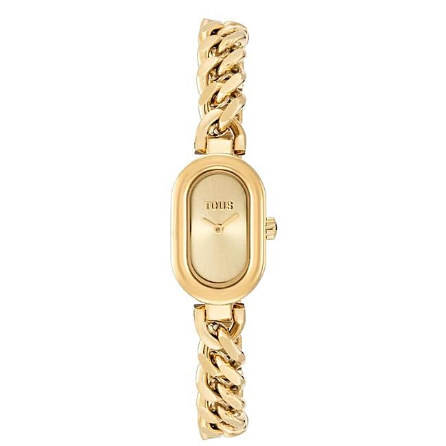 Reloj analógico con brazalete en forma de cadena gruesa y una caja de acero alargada y redondeada en color dorado. El diámetro de la caja es de 18 mm. Precio: 189 euros.