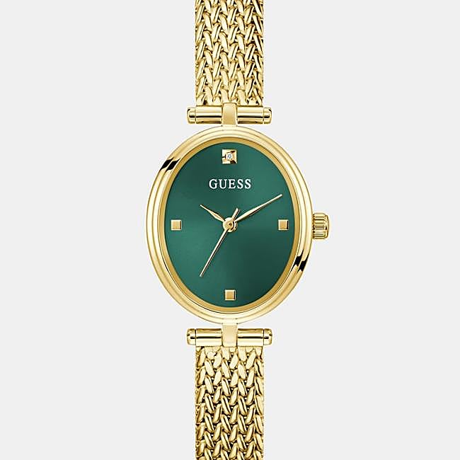 Nos encanta este reloj analógico que se caracteriza por una pulsera de malla en color dorado confeccionada en de acero 24 mm y por una esfera ovalada de color verde oscuro. Precio: 179.90 euros.