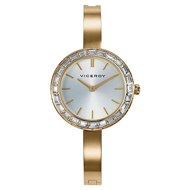Este reloj de mujer fusiona la elegancia del acero IP dorado con el brillo sutil de un bisel adornado con circonitas en color verde. Su esfera verde, con índices y agujas en tono dorado, crea un contraste sofisticado y vibrante. El brazalete de acero IP dorado aporta un acabado lujoso, mientras que el cristal mineral asegura resistencia y claridad. Precio: 107,10 euros.