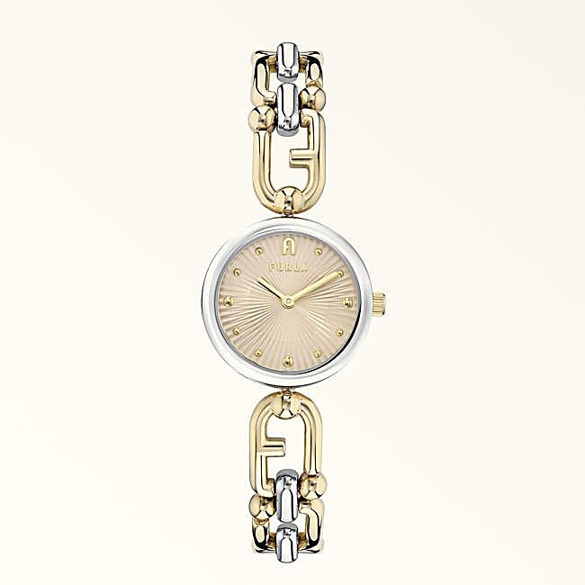 Un reloj delicado y moderno con elegantes líneas redondeadas. Este Furla Mianuvola cuenta con una esfera personalizada que presenta la firma de la marca en el duodécimo índice. Gracias al brazalete en metal con eslabones en forma de logotipo Arco, se puede llevar tanto de día como de noche. Precio: 169 euros.