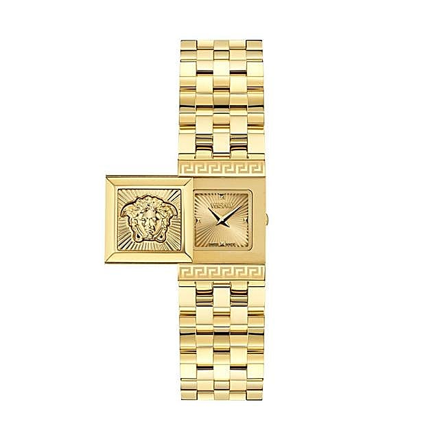 Reloj con caja 25mm de acero inoxidable dorada, esfera secreta dorada con cabeza de Medusa en el cierre deslizante, brazalete dorado, movimiento de cuarzo suizo de 2 agujas y logotipo de Versace a las 12h. Su delicada caja esconde un tesoro de elegancia y encanto. Precio: 1.390 euros.