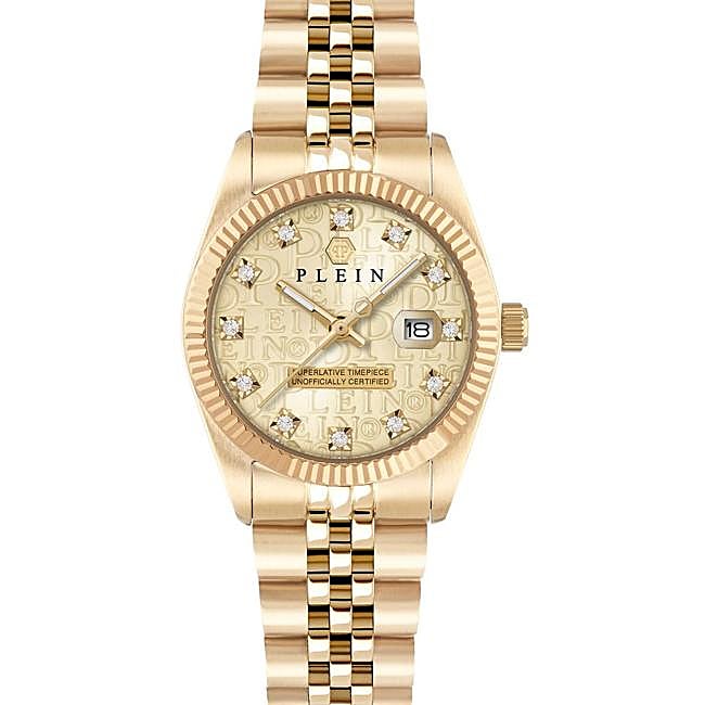 Reloj con caja de acero inoxidable 28mm plateada, esfera dorada con logo manía Plein, brazalete plateado. Este diseño atemporal ofrece una armonía perfecta de fuerza y estilo. La esfera explota con la manía del logotipo, un toque característico que personaliza el diseño imperecedero con una dosis de la incontrolable esencia de Philipp Plein. Precio: 450 euros.