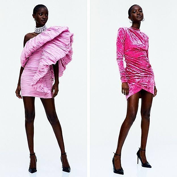 Pasamos al color de la temporada, el rosa, con dos diseños deslumbrantes. Puedes optar por el modelo que arrasa entre las influencers, un vestido corto en tejido jacquard efecto plisado y arrugado, de escote asimétrico con un solo hombro decorado por dos maxi volantes voluminosos rellenos de tul, en rosa claro, con un coste de 199 euros, que merecen la pena por esta prenda super especial. O, un mini vestido en velour suave (efecto terciopelo), con manga larga, hombreras, cuello elevado, frente cruzado de doble capa drapeado y bajo asimétrico, en rosa fucsia, por 59,99 euros.