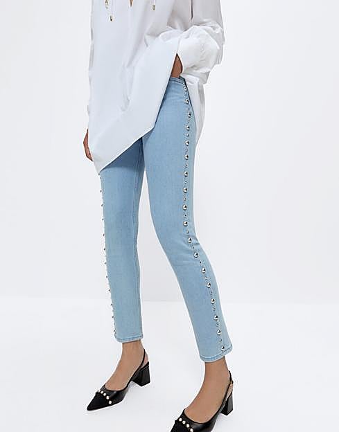 No hay nada más básico, ponible y que nunca pasa de moda que unos vaqueros. Si todavía no has desterrado los pitillo y eres de las que cree que se van a seguir llevando, ficha estos tan originales con con tachuelas que darán un toque original a tus looks. Están rebajados a 51,75 euros, en vez de 69 euros.
