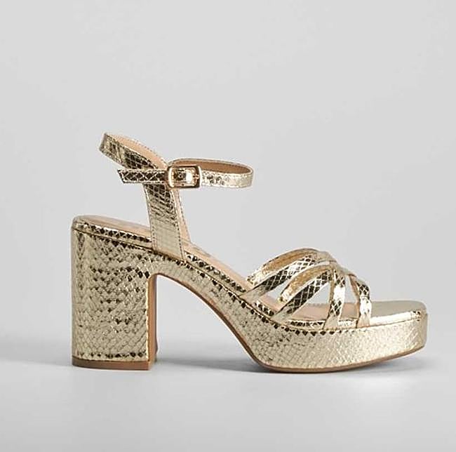 Si la altura no es lo tuyo y prefieres un tacón algo más bajo, prueba con estas sandalias de Mustang. Tienen el tacón ancho, un diseño de tiras y un acabado color oro perfecto para tus looks de invitada. Precio: 49,99 euros en Merkal.