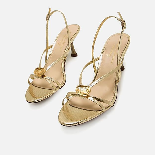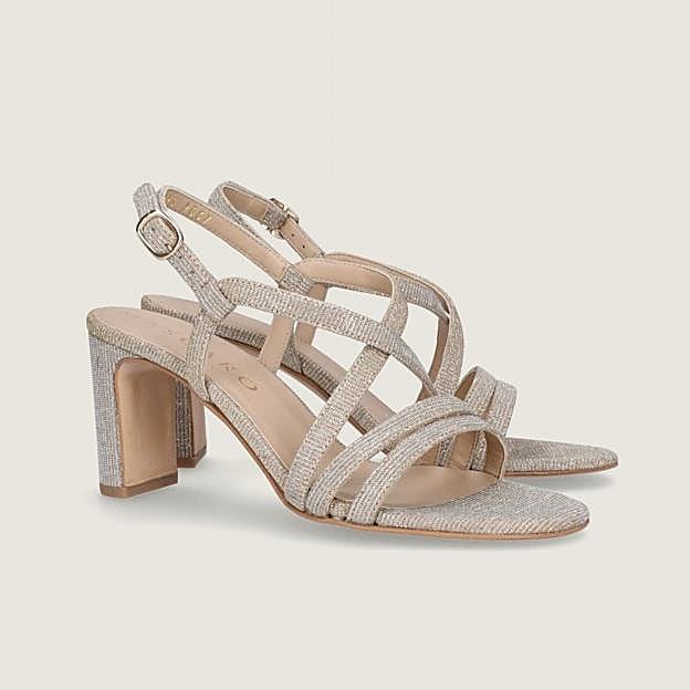 Para las que prefieren un tacón más cómodo, proponemos esta sandalia de Mascaró. Es el modelo Maria en tela brillante color oro champán con tacón de 8cm, suela de goma, plantilla y forro de piel. Precio: 249 euros.