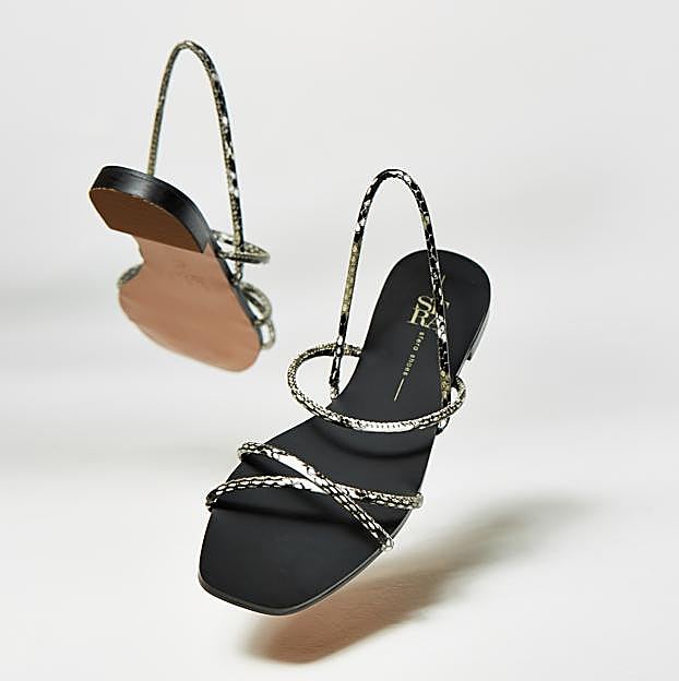 El otro modelo es para las que prefieren unas sandalias más clásicas y sencillas y que no tengan un diseño tan casual. Se trata de una sandalia plana caracterizada por unas tiras muy finas de efecto piel de serpiente. ¿El punto a favor? Que el estampado es muy sutil y en colores neutros por lo que también son muy combinables y ponibles. Además, nos encantan también porque cuestan 17,99 euros. ¡Chollazo!