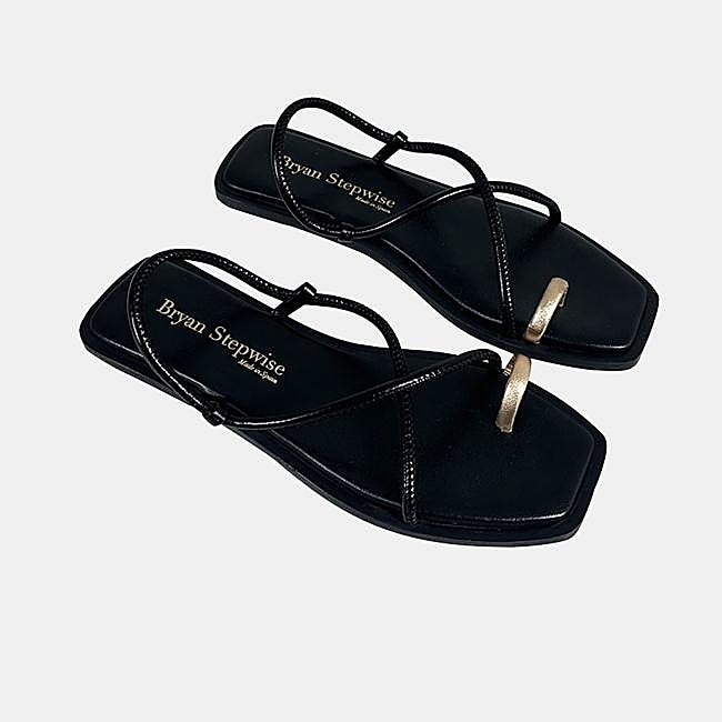 El detalle metálico en el dedo pulgar del pie es una de las tendencias más protagonistas del momento y estas andalias planas de piel de Bryan Stepwise con ideales para unirte a ella. De color negro y con tiras finas, están entre nuestras favoritas.
