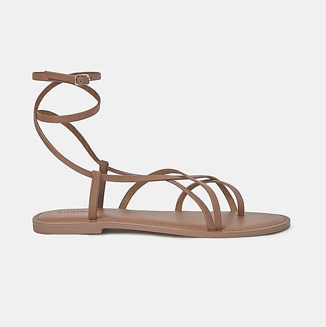 De estilo romano, lo de atar la sandalia al tobillo también se lleva muchísimo. Puedes probar con esta sandalia plana de cuero con tiras atadas al tobillo con hebilla en color marrón que es de Brownie.