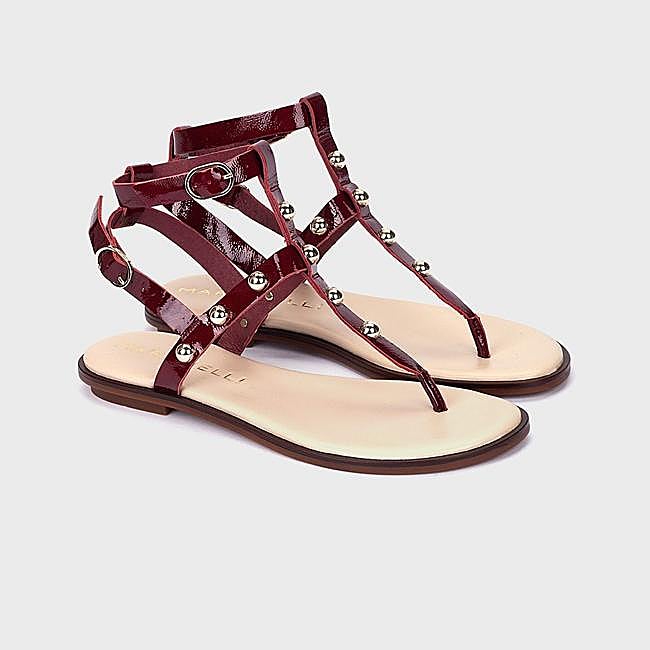 Ficha la sandalia Mazzini de Martinelli en color rojo oscuro ideal. Confeccionadas en 100% cuero, con punta redonda y una suela plana de 2cm, tienen como detalle principal las tachas de las tiras sobre el empeine que hace que sea un modelo a la última.