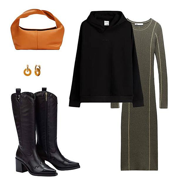 Siempre confía en tu sudadera de Bershka (o en la de tu novio), 22,99 euros; combínala con un vestido verde como este de Zara, 39,95 euros; y añade unas botas cowboy de calidad como esta de Martinelli, 210 euros. Añade el toque de gracia con un color como el naranja: bolso Massimo Dutti, 79,95 euros; y pendientes de Bylia, 33,95 euros.