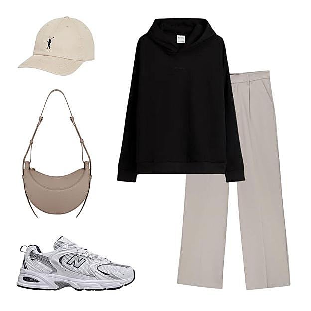En este caso, la sudadera de Bershka vuelve a ser fundamental, 22,99 euros; lo puedes combinar con un pantalón de traje de Pull&Bear, 25,99 euros, una gorra de Polo Club, 49 euros; las famosas zapatillas 530 de New Balance, 110 euros; y el preciosísimo bolso número dix de Polène, 350 euros.