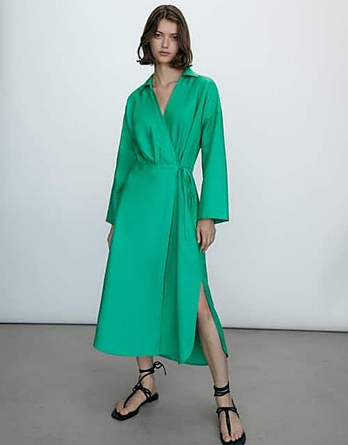 Se trata de un vestido de largo midi protagonizado por un bonito tejido satinado en color verde y por un diseño con cuerpo cruzado, cuello solapa y manga larga acampanada. Lleva la falda fluida, también cruzada y con una abertura lateral. Cuesta 79,95 euros y está disponible desde la talla XS a la XL. ¡Es ideal!