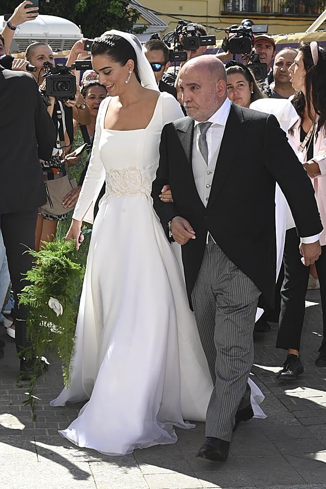 A la entrada de la iglesia, Bárbara aparece radiante con la tiara ceñida sobre el recogido, una pieza ligera y refinada que enmarca su rostro con delicadeza. La elección resultó especialmente acertada al combinarse con el velo de tul y con los pendientes art decó, creando un efecto de armonía y sofisticación. Su estilismo transmite la serenidad de una novia clásica, pero con un aire moderno y personal que la distingue.