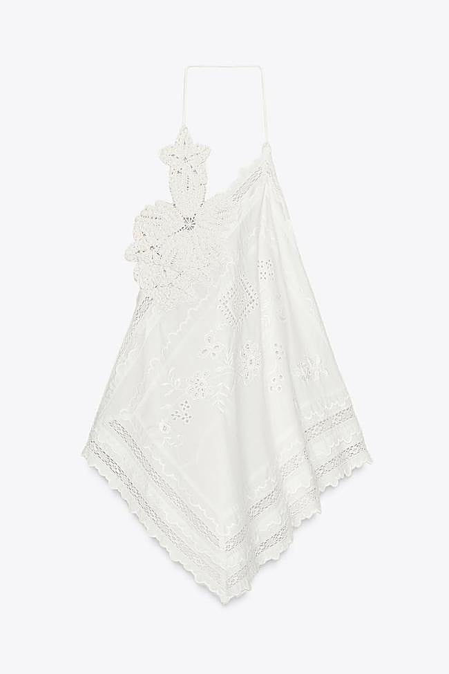 Por último, la opción más casual. Si te ha gustado la idea, pero te parece una prenda demasiado elegante y a la que no vas a sacar mucho partido, atenta a esta otra propuesta. Zara también tiene la venta un top asimétrico estilo lencero, pero de color blanco y confeccionado en algodón. Es un diseño más informal,bordados y el diseño de una flor que nos parece ideal. Cuesta 39,95 €