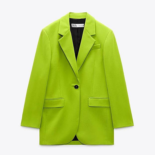 Su idea se basa en combinar junto al top, una blazer verde lima oversize que también está disponible en Zara por 79,95 euros. Añade unos vaqueros rotos ajustados con largo tobillero y complementa con unos zapatos destalonados de tacón cómodo con detalle de lazo en color azul claro, gafas de sol con montura azul y bolso acolchado de tamaño mediano en tono crema.