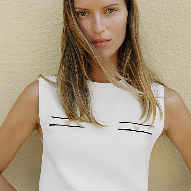 ¡Ahora sí que sí! Ha llegado el momento de comenzar a descubrir las primeras prendas de cara a los días más cálidos del año. Este top sin mangas, que combina el blanco y el negro con detalles dorados, es uno de nuestros favoritos.