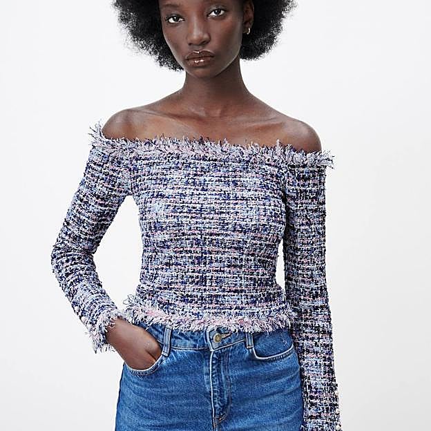 En primer lugar, está el top en tejido estructura con escote bardot con hombros al descubierto, manga larga, fit ajustado y acabados desflecados, en tonos morado y azul. Disponible en Zara por un precio de 29,95 euros y en las tallas S, M y L.