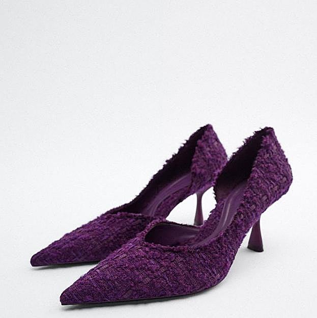 Y, para terminar el look, también en Zara podemos comprar estos zapatos tipo salón de tacón bajo, con abertura lateral, acabado en punta y confeccionados en tejido tweed, color morado, a solo 35,95 euros. ¡Ideales!