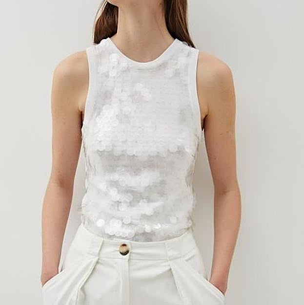 En Sfera han apostado por el diseño nadadora con cuello de caja y mangas sisa para este top con lentejuelas medias en color amarillo y en blanco. Disponible en las tallas S, M y L, ha pasado de 19,99 euros a costar 15,99 euros.