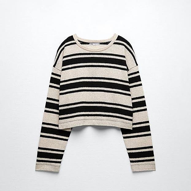 Se trata de un set de dos piezas en punto fino con estampado a rayas horizontales, tono crudo y negro. La parte de arriba es un jersey con acabado rústico. Es un diseño cropped o corto, con silueta relajada, manga larga con hombro caído y escote redondo.