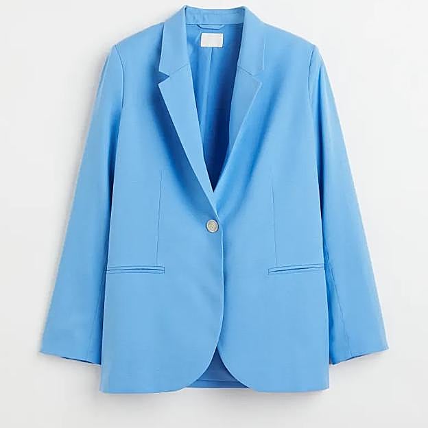 Es un traje formado por una americana cruzada de botonadura sencilla en mezcla de lyocell y algodón. Es un modelo recto con solapas de muesca y bolsillos delanteros ribeteados que cuesta 29,99 euros y que tiene su pantalón a juego. Este es un diseño de talle alto con cierre oculto delante y elástico detrás, cierre de cremallera y perneras ligeramente pitillo con raya que también cuesta 29,99 euros. Es decir, por menos de 60 euros puedes hacerte con un dos piezas al que sacarás muchísimo partido.