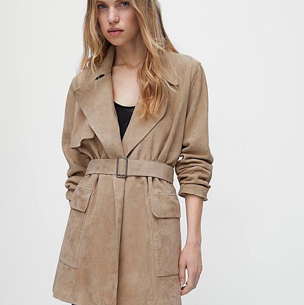 Se trata de un trench corto de ante, confeccionado en piel ovina. Este se caracteriza por un cuello con solapas de muesca, cierre abierto con cinturón de lazada a juego, silueta fluida y bolsillos de parche con tapetas en el delantero, en tono arena. Comparaciones...las que se quieran.