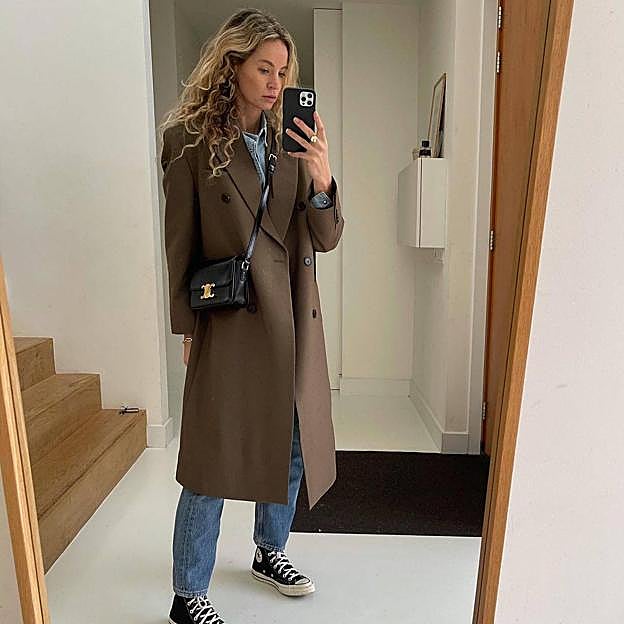 Después, para el calzado elige uno botines planos tipo chelsea o acordonados (también valen cowboy con un ligero tacón) y una bandolera o shopper. Mientras que si quieres ir más cómoda, Anouk Yve propone unas versátiles Converse negras (o crudo), pero también valen unas deportivas retro New Balance.