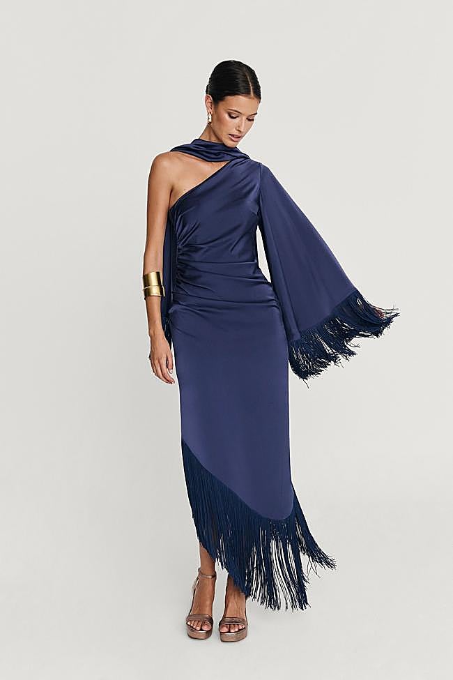 Confeccionado en crepe de satén, este vestido de Miphai se caracteriza por un elegante escote y falda asimétricos, mientras que los flecos, presentes en la manga y el bajo, añaden un toque de dinamismo con cada paso. Precio: 159,99 euros.