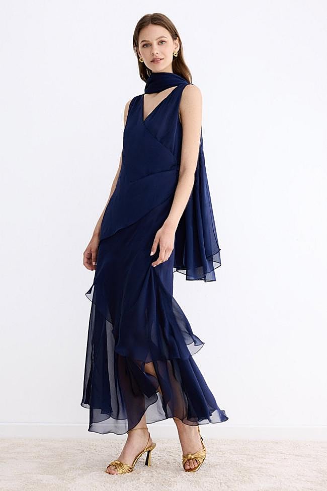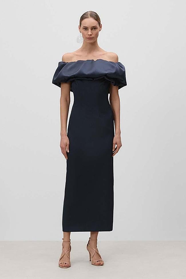 Vestido de largo midi entubado, con escote barco formado por volantes abullonados. Es de Simorra y tiene un ierre mediante cremallera invisible en la espalda. Precio: rebajado a 278 euros.