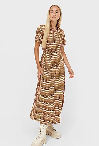 Hablamos de un vestido camisero de manga corta y de largo midi que tiene un bonito estampado geométrico en tonos marrones. Un diseño con un tejido fluido, fresco y cómodo súper ponible que es ya uno de los favoritos del momento. Sin embargo, no solo nos encanta por lo bonito que es, sino también porque es súper ponible y puedes llevarlo de dos manera.