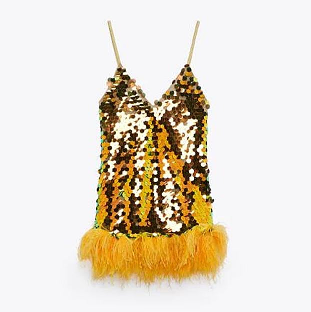 Hablamos de un vestido corto de tirantes finos que está confeccionado con lentejuelas grandes en color amarillo y que lleva el bajo adornado con plumas a tono. Es de edición limitada, cuesta 89,95 euros y, sin duda, ya es uno de los favortísimos de las influencers. Y no es para menos, porque mezcla dos imprescindibles de la Navidad como son las plumas y las lentejuelas consiguiendo un diseño perfecto.
