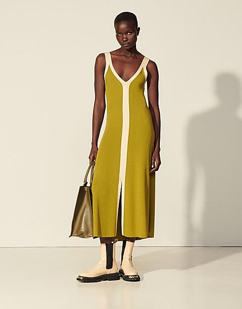 Se trata de un vestido bicolor de la firma Sandro. Un diseño de largo midi y corte recto caracterizado por un bonito color verde pistacho combinado con el crudo en los remates y en un franja central que recorre toda la prenda de manera vertical. Tiene tirantes y un escote en forma de pico que favorece muchísimo al pecho y que queda de maravilla.