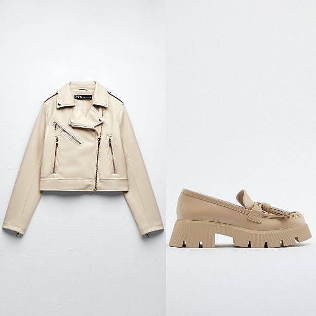 Ella conjunta el vestido con una biker efecto piel con cuello solapa, detalles metálicos y cremallera en dorado, color crudo, disponible en Zara por 39,95 euros. Y, unos mocasines de suela track dentada con mucho volumen y detalle de borla, en tono arena, por el mismo precio, 39,95 euros y también de Zara. Añade tu bolso negro favorito y listo.