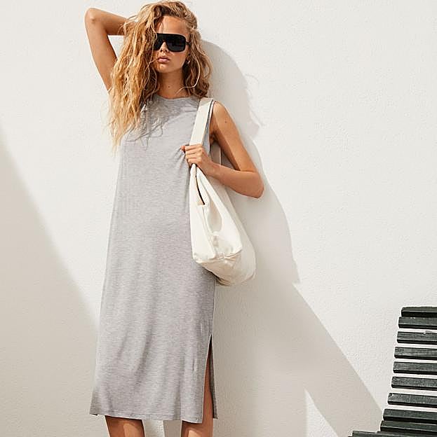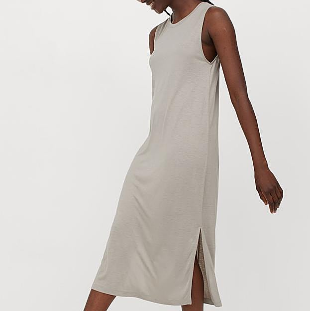 De diseño midi, confeccionado en punto suave de viscosa con caída y sin mangas, tiene abertura en ambos laterales por encima de la rodilla.