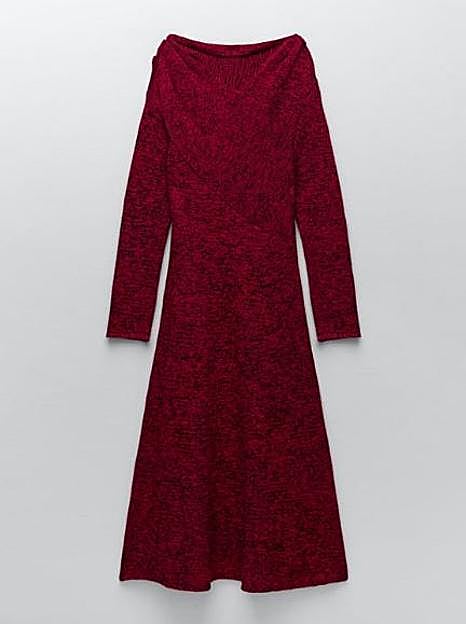 Se trata de un vestido de punto y tejido jaspeado en rojo y negro con un diseño de lo más original y favorecedor: escote abierto, falda de corte evasé y manga francesa. Cuesta 49,95 euros y es una prenda que tiene todas las papeletas para ser una de las favoritas del momento por lo bien que queda, pero también por lo ponible que es.