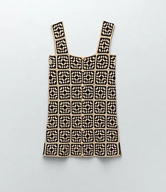 Se trata de un vestido mini que tiene un diseño recto y que está protagonizado por un diseño con escote cuadrado y tirantes anchos. Tiene la falda de corte evasé y un cierre de botones forrado que le da un toque ideal. Pero sin duda, lo mejor de la prenda es su tejido de punto crochet en color negro y beige y con formas geométricas.