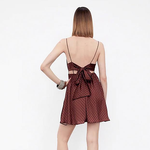Nuestro favorito, aunque con un lunar mucho más discreto que el otro, es este vestido corto en color chocolate con estampado en beige. Confeccionado con al menos un 30% de poliéster reciclado, viene con escote de pico y tirantes finos.
