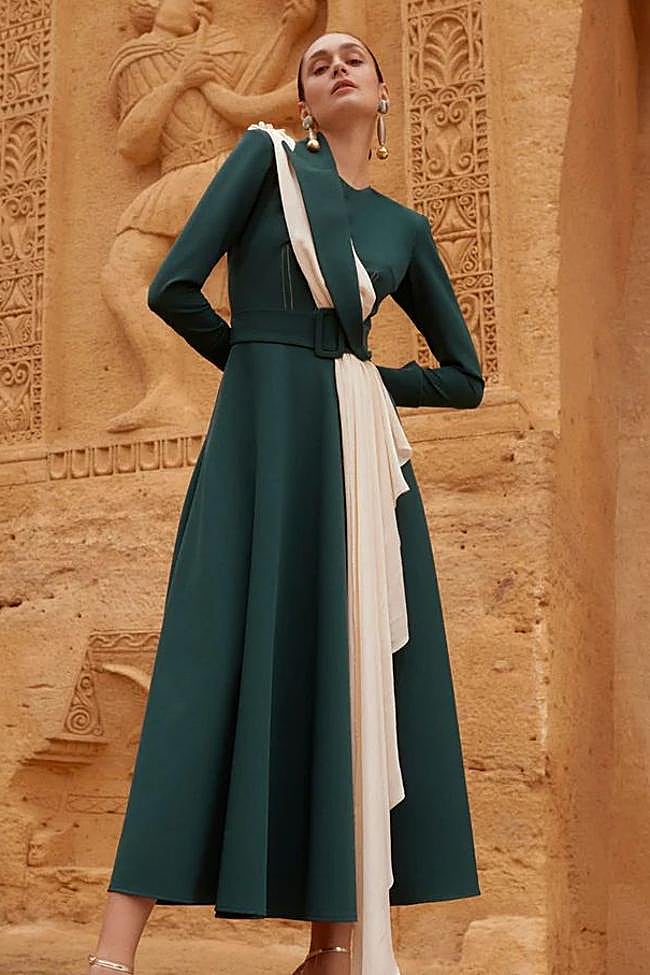 IQ Collection se ha posicinado como la marca de invitadas favorita de aquellas que llevan la elegancia clásica y el gusto por los diseños geométricos por bandera. Uno de sus mejores ejemplos que, además, es una gran opción para bodas de esta temporada, es este vestido asimétrico en verde esmeralda, un diseño de Roberto Diz IQ Collection. El diseño de manga larga y falda en A rompe con una gasa en diagonal en color beige y el cinturón que define la silueta, dando como resultado una propuesta preciosa y de lo más original.