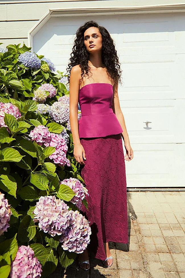 Este vestido largo de Redondo Brand nos parece un acierto seguro para cualquier tipo de bodas de la temporada. Combina el escote palabra de honor con peplum y con falda en jacquard, todo ello en un precioso color violeta muy sofisticado y perfecto para combinar con esas joyas que tienes reservada para las citas más especiales.