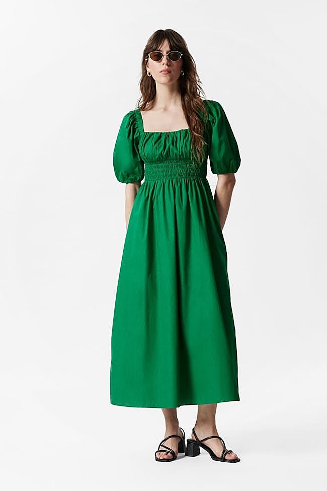 Vestido midi de Cos con mangas cortas abullonadas, escote corazón y silueta ligeramente plisada. Destaca por su color verde favorecedor y su silueta estructurada. Precio: rebajado a 49 euros.