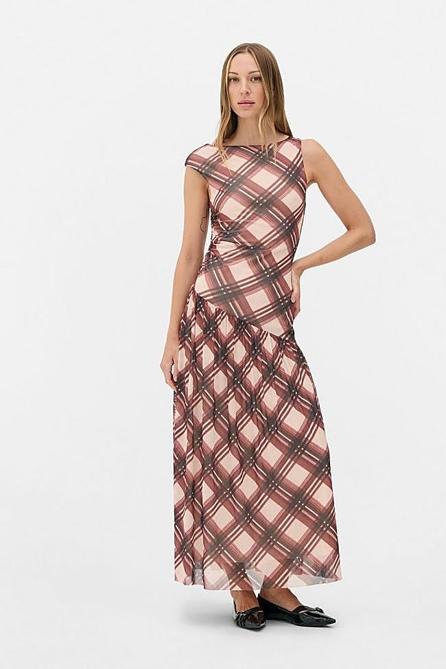 La cuarta propuesta es para quienes buscan estampados diferentes. Si con el otoño no renuncias al color ni a las prendas llamativas, este es para ti. Se trata de un vestido midi sin mangas, de cuerpo asimétrico y con un original corte en diagonal a la altura de la cadera del que parte una falda fluida. Lo más importante es su estampado de cuadros en tonos rosas y marrones, que no nos puede gustar más para el otoño. Cuesta 28 euros.