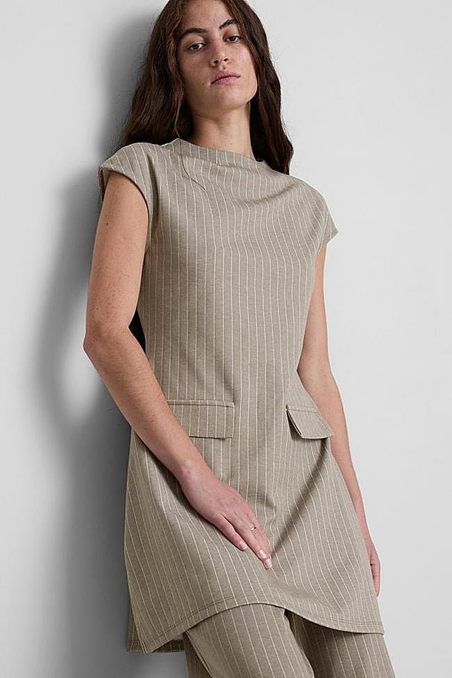 Si todavía no te has hecho con ninguna prenda de este estilo, te recomendamos fichar este vestido tan ponible que hemos encontrado en la nueva colección. Es un diseño largo sin mangas, cómodo y de corte holgado, con bolsillos. Ideal para lucir ahora con una chaqueta o en invierno con una camiseta de cuello alto debajo. De hecho, desde la firma proponen combinarlo con bailarinas y una gabardina encima: un look de entretiempo perfecto que puedes comprar por tan solo 28 euros.