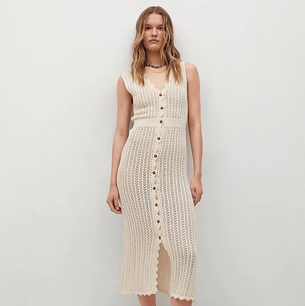El vestido de punto calado en color crudo forma parte de la última colección de Mango y es de diseño largo, confeccionado en algodón y con cierre de botones en delantero a contraste. Tiene la cintura entallada y las mangas sisa, y también es perfecto para llevar con vaqueros y los últimos botones desabrochados, como si fuese un chaleco.