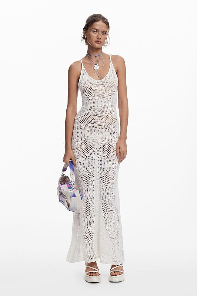 Vestido de Desigual de largo midi y un fit ajustado. Está confeccionado en crochet, con tirantes finos ajustables, cuello redondo y falda evasé. Precio: rebajado a 59,50 euros.