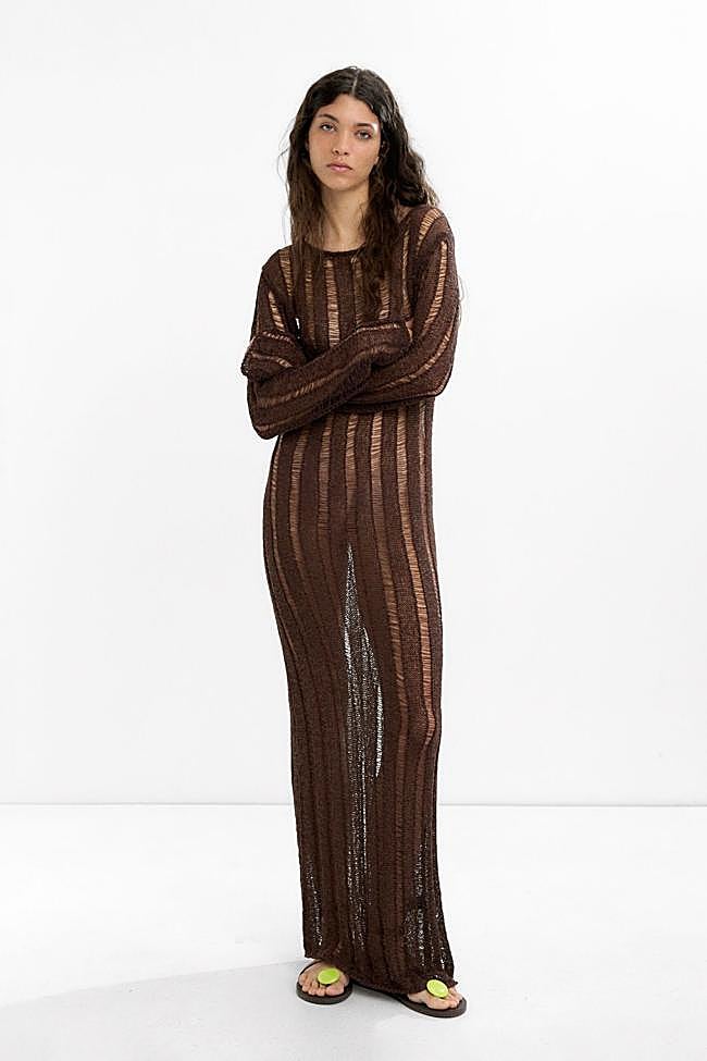 En Parfois tienes este vestido largo de punto abierto en color marrón chocolate. Tiene el cuello redondo, escote en la espalda con tira para atar y manga larga. Precio: 39,99 euros.