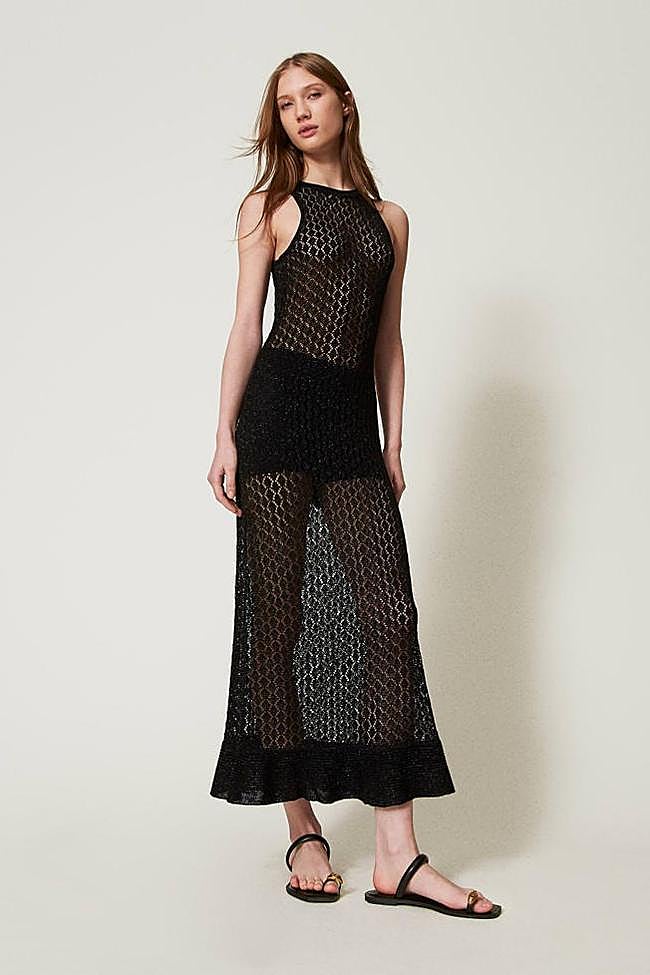 Vestido largo de rejilla de hilo de lúrex, con cuello redondo, logotipo en forma de corazón en la parte trasera, forro y corte ceñido. Es de Twinset. Precio: 151,20 euros.