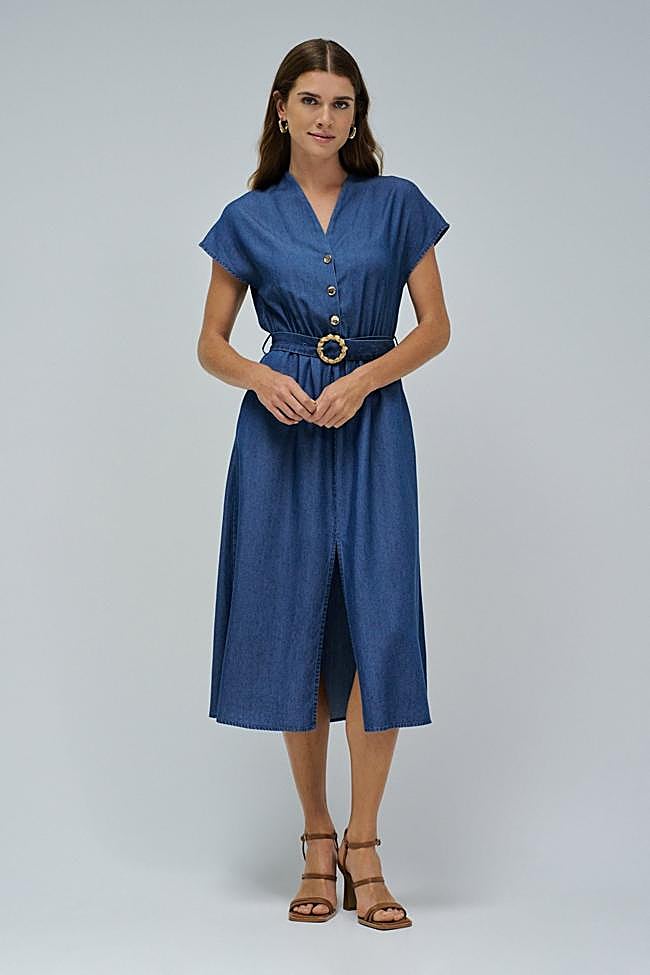 Otra opción de vestido vaquero camisero la encontramos en Salsa Jeans con esta propuesta midi de manga corta y cierre abotonado que promete ser todo un éxito en tus looks informales y de oficina. El detalle del cinturón con hebilla dorada eleva la prenda y permite sacarle partido en esos planes improvisados de afterwork que tanto alegran el verano: basta que lo combines con tus sandalias planas especiales favoritas y unas gafas de sol elegantes y tendrás el look diez de la temporada.