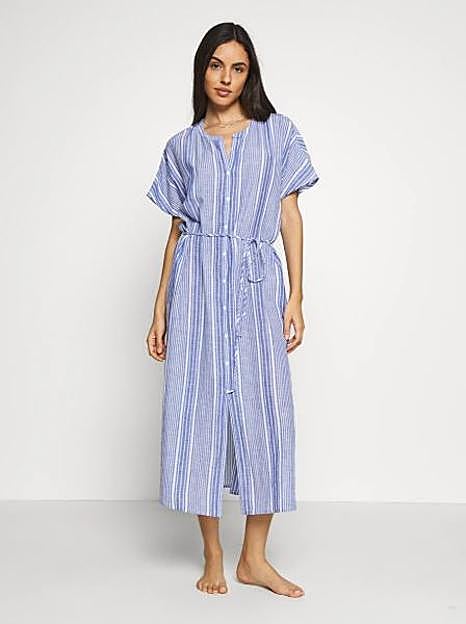 Se trata de un vestido midi de corte recto con escote en pico y media manga ancha y acampanada. Es un diseño fresquito y holgado, perfecto para lidiar con el color, que además lleva unas aberturas laterales en la falda. Un vestido tipo caftán que tiene como protagonista un estampado de rayas verticales en tonos azules. Ideal, ¿verdad? La mala noticia es que Vicky no ha desvelado de dónde es.
