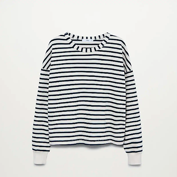 Se trata de una sudadera con estampado de rayas (17,99 euros) en negro y fondo de color blanco. Es una sudadera sencilla, con cuello redondo, manga larga y un diseño ancho. Está fabricada en algodón orgánico y es ya uno de los éxitos de Mango Outlet. Tanto es así que algunas tallas como la S y M tienen lista de espera.